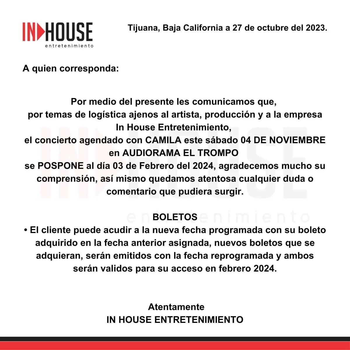 Etiquetas: #audioramaeltrompo, #Camila Tour, #CamilaenTijuana, #conciertosenTijuana, #InHouseEntretenimiento, #todocambio, Concierto, Pospuesto, Tijuana