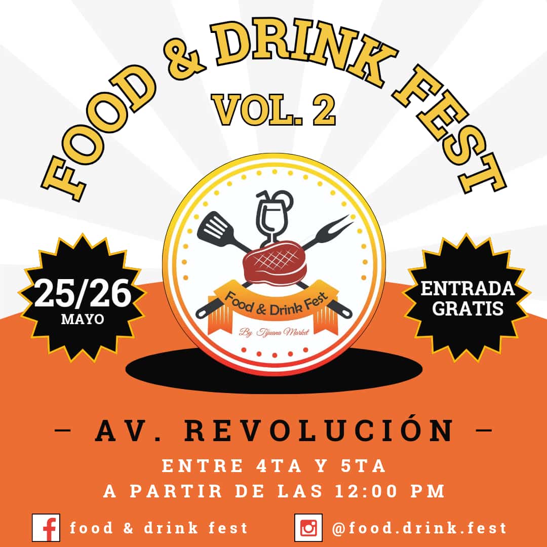 No te pierdas Food & Drink Fest Vol. 2 en Tijuana el próximo 25 y 26 de Mayo a partir de las 12:00 pm en Av. Revolución entre 4ta. y 5ta. Un evento totalmente familiar donde podrás encontrar postres, comida, variedad en bebidas, música en vivo, invitados especiales y muchas sorpresas más.