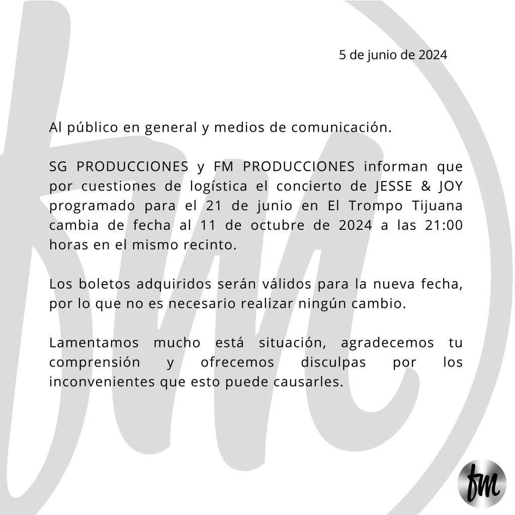 El evento programado para el 21 de junio en Tijuana se pospone para el 11 de octubre de 2024 en el mismo lugar. Los boletos adquiridos son válidos para la nueva fecha.