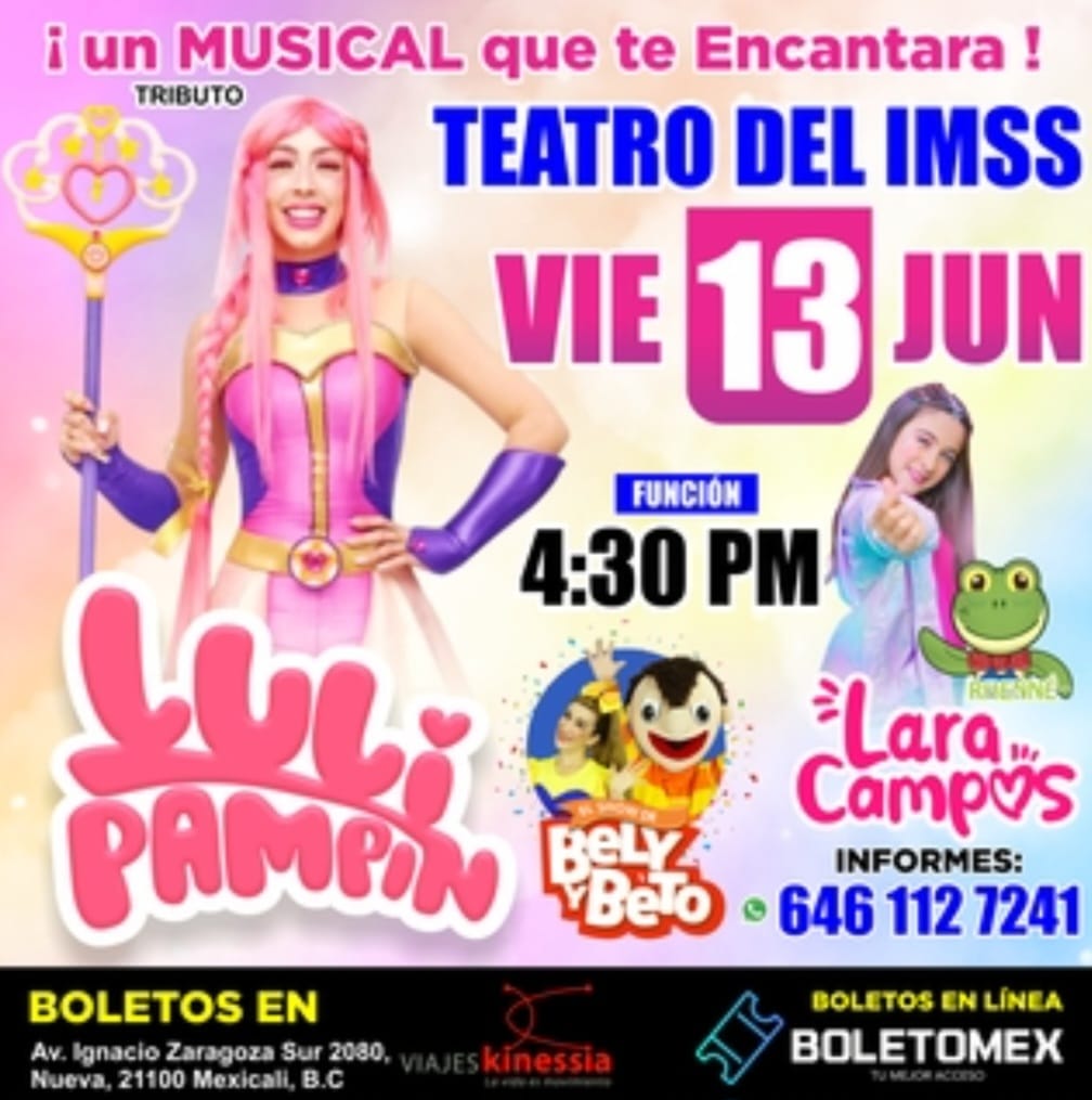 El espectáculo familiar Tributo a Luli Pampín, Lara Campos y Bely y Beto en Mexicali se presentará el próximo viernes 13 de junio de 2025 en el Teatro del IMSS. Habrá dos funciones: a las 4:30 y a las 6:30 pm. Este evento está diseñado para el disfrute de toda la familia.